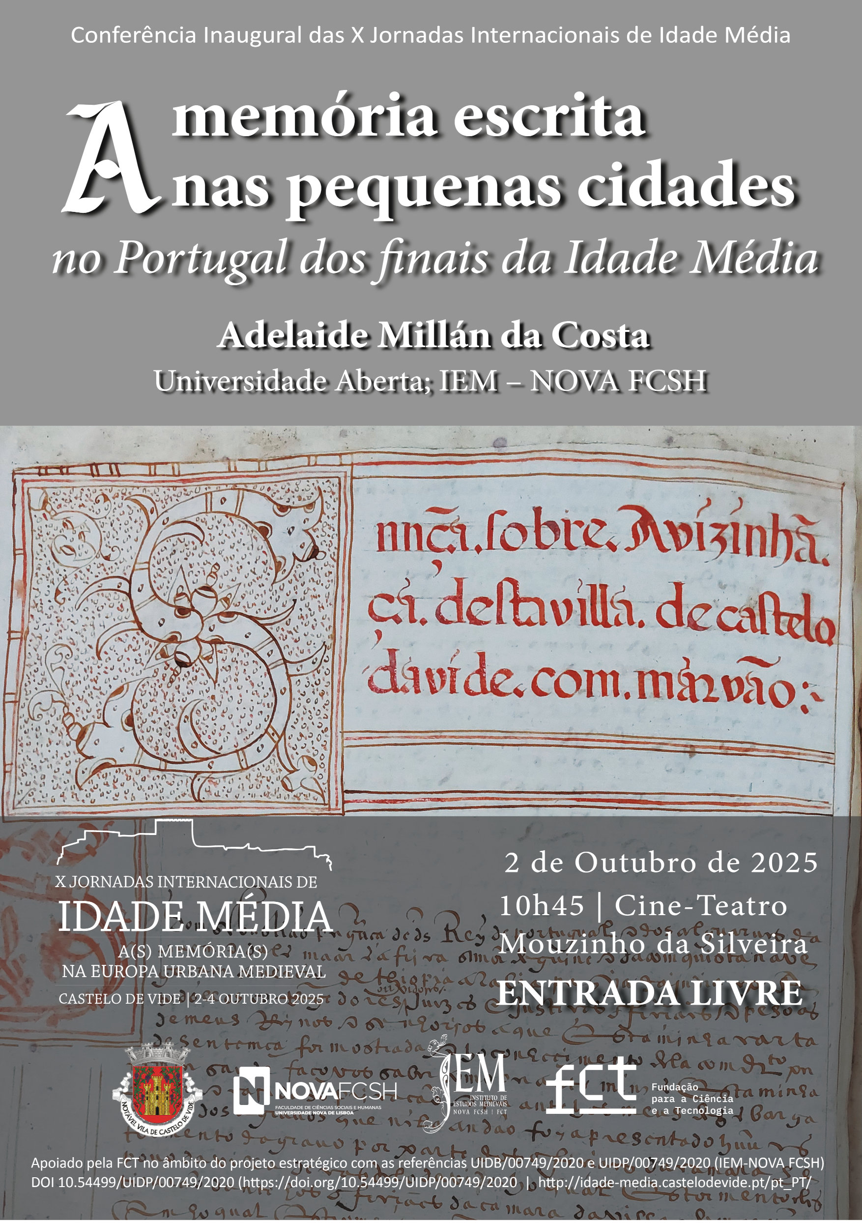A conferência, intitulada “A memória escrita nas pequenas cidades no Portugal dos finais da Idade Média”, será apresentada por Adelaide Millán da Costa.